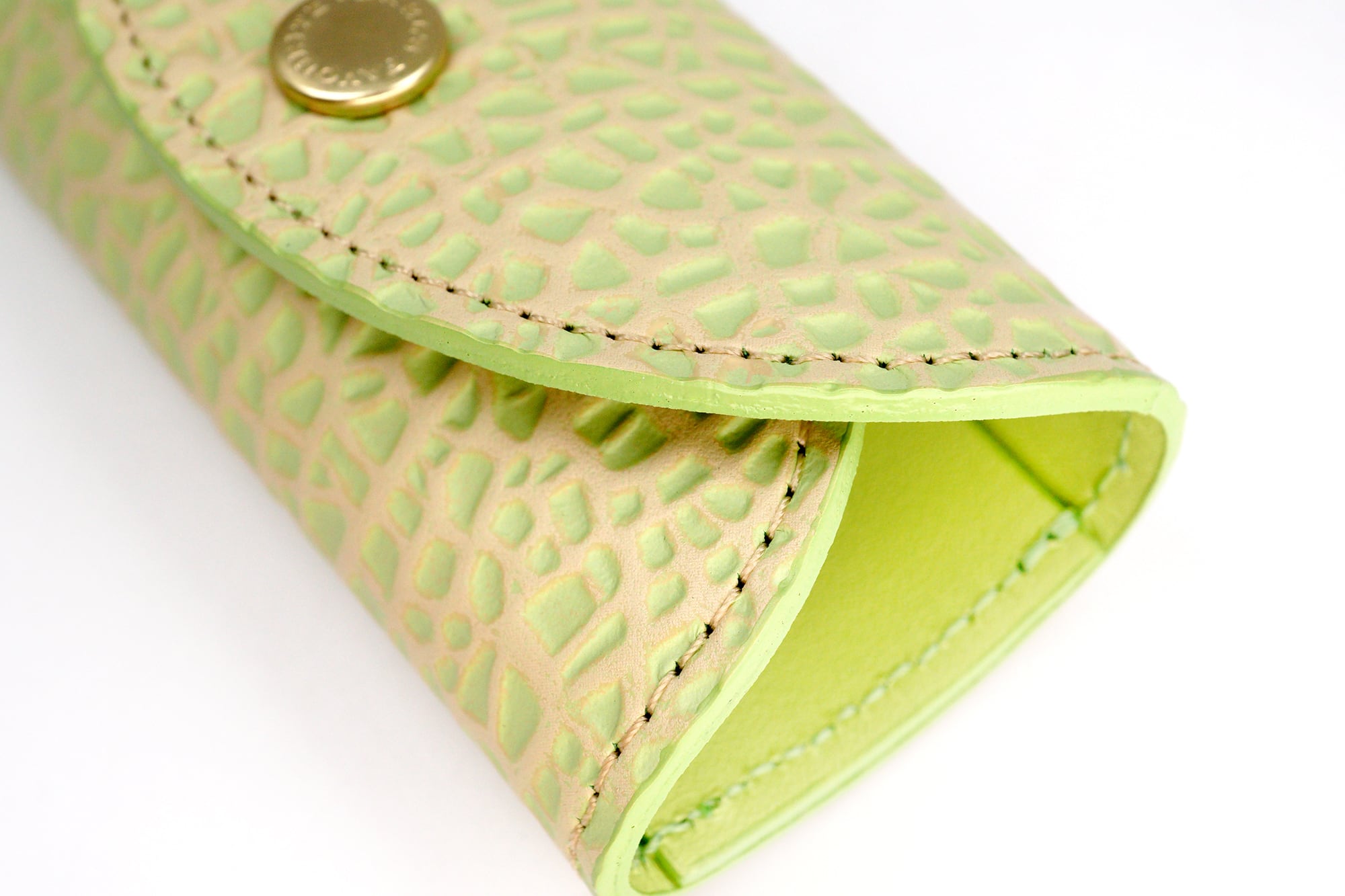 牛革を特殊加工することで、見た目はメロンそのものな上に、表面は凸凹していて本物そっくりの触り心地にしました。プリントでは表現できないリアルな質感が特徴です。また、品種によって柄や色味も変えています。夕張メロン(赤肉)はグリーン系メロン革で、クラウンメロン(青肉)はアイボリー系メロン革となります。
