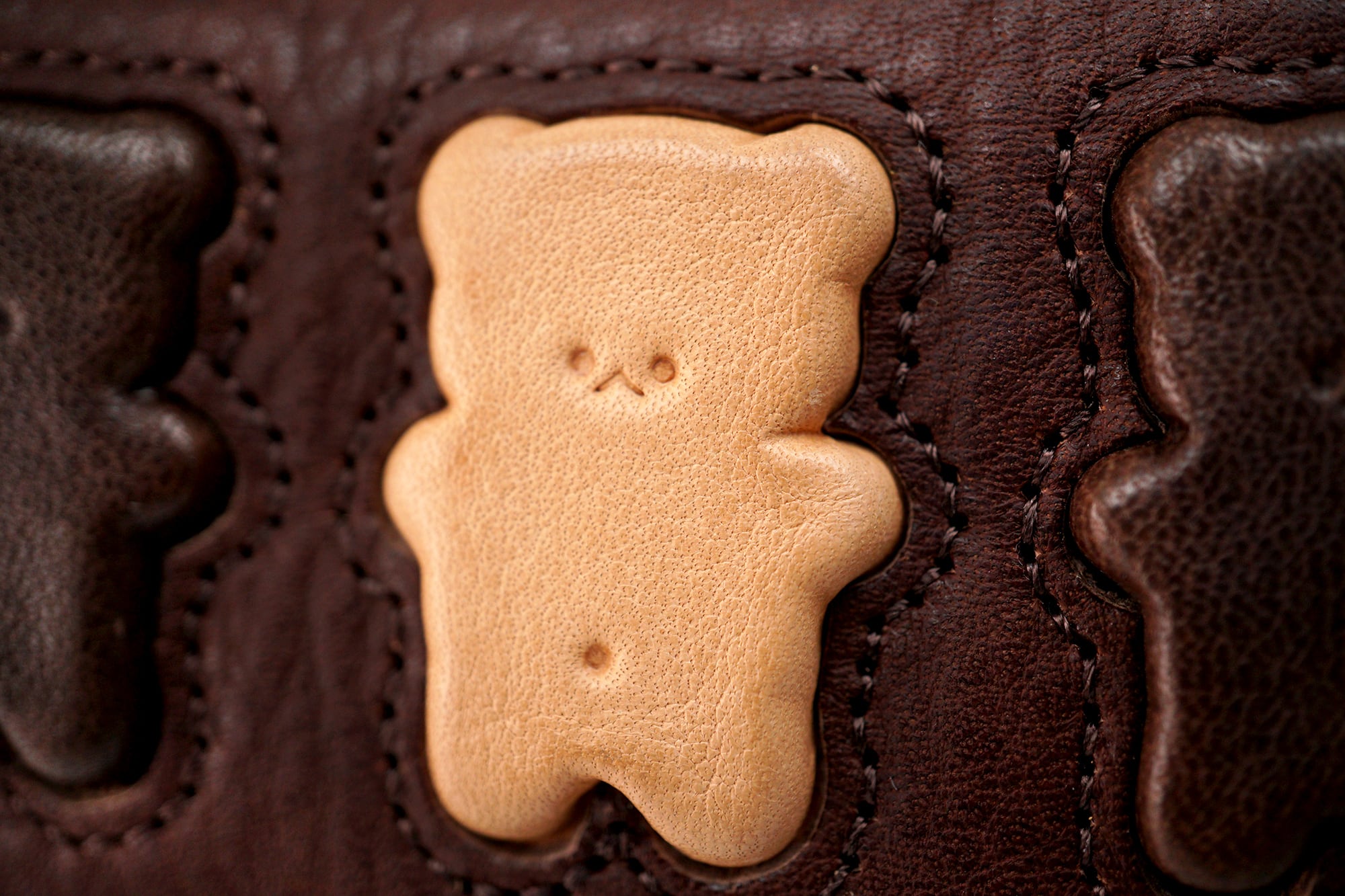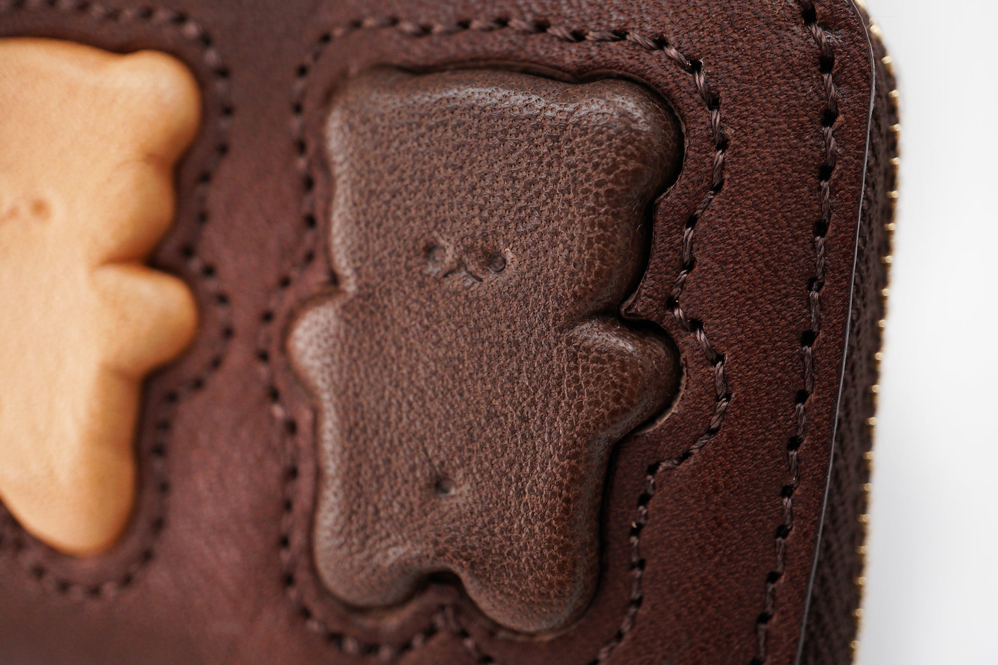 クマちゃんの形は、アールスフェボリットオリジナルデザイン。プレーンとココア、2種類のクッキーのような風合いの牛革に、ぷっくりした立体感と表情を1匹ずつ手作業で付けています。キーケース本体も、焼き菓子の表面のようにナチュラルな質感の牛革です。