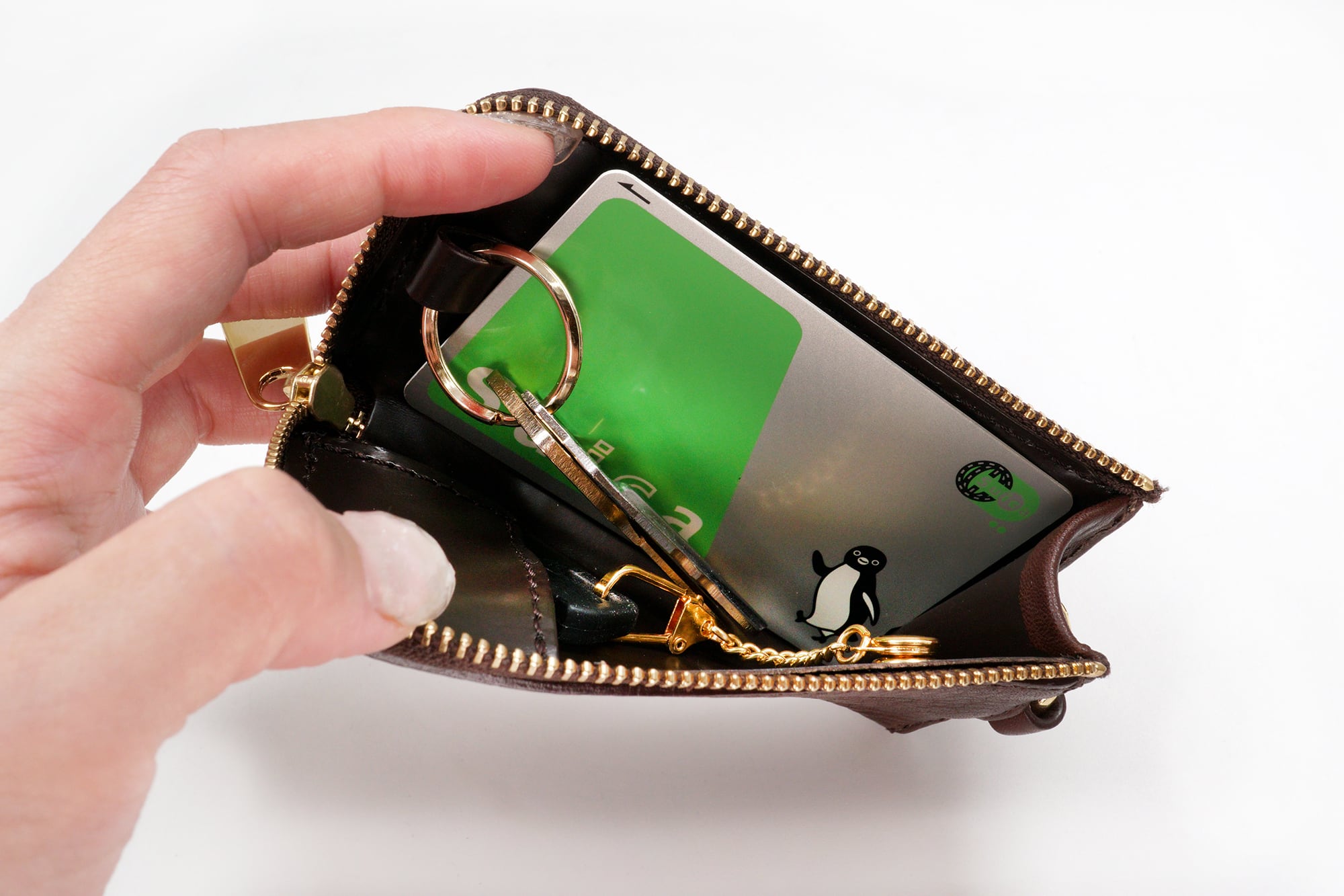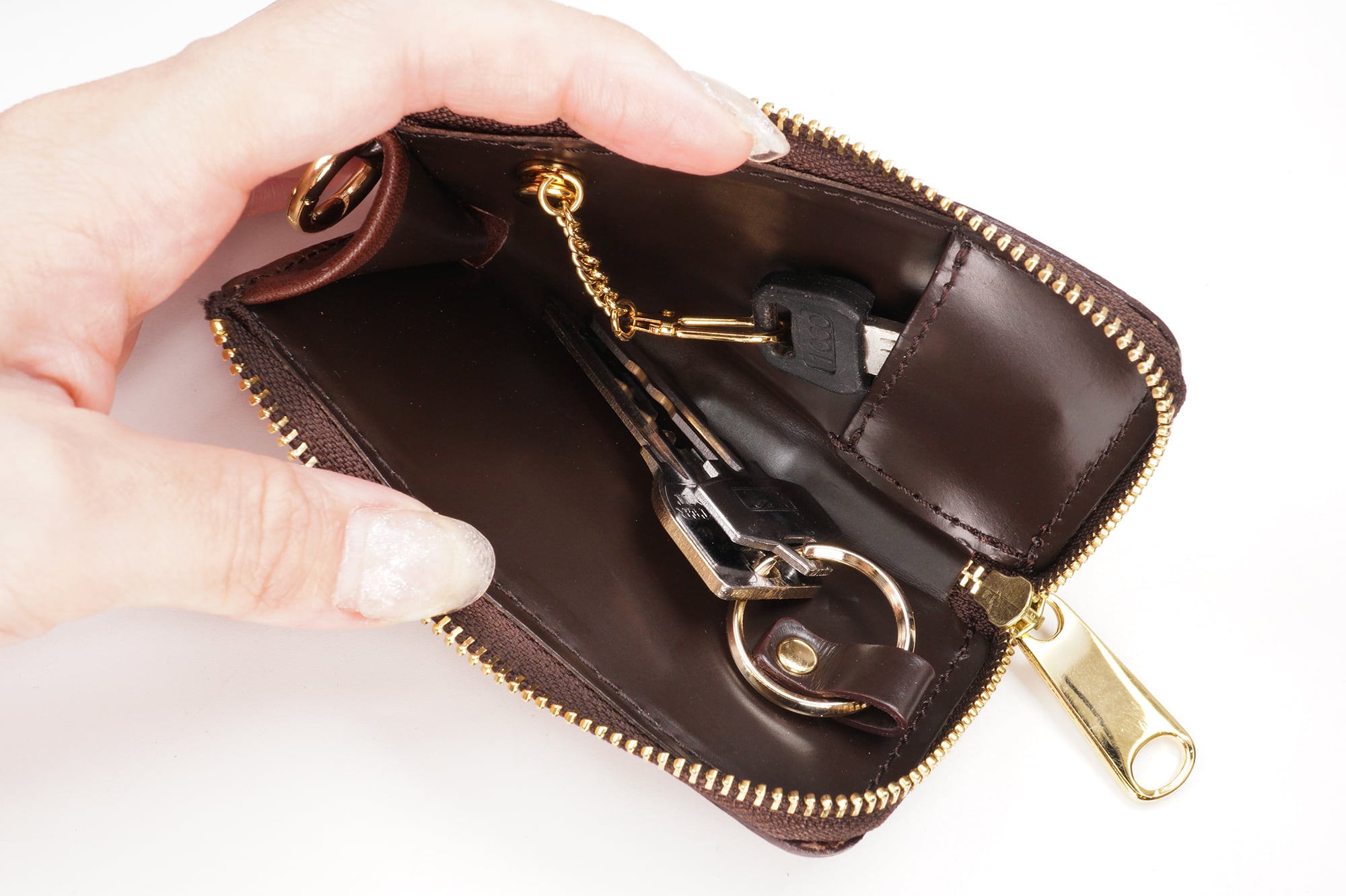 内装もチョコ色の革をセレクト。内装には、一般的な鍵を数本程度まとめて付けられるリング金具と、自転車のカギや立体駐車場のカギなど、取り外して使用する時に便利な着脱式のキーチェーンが付いています。