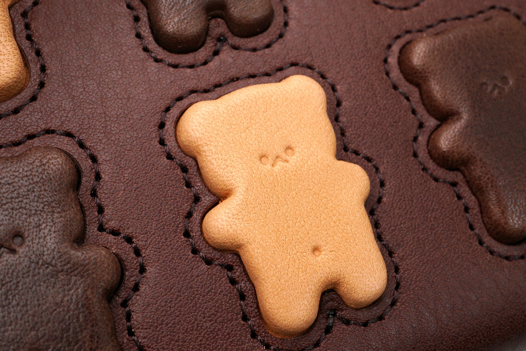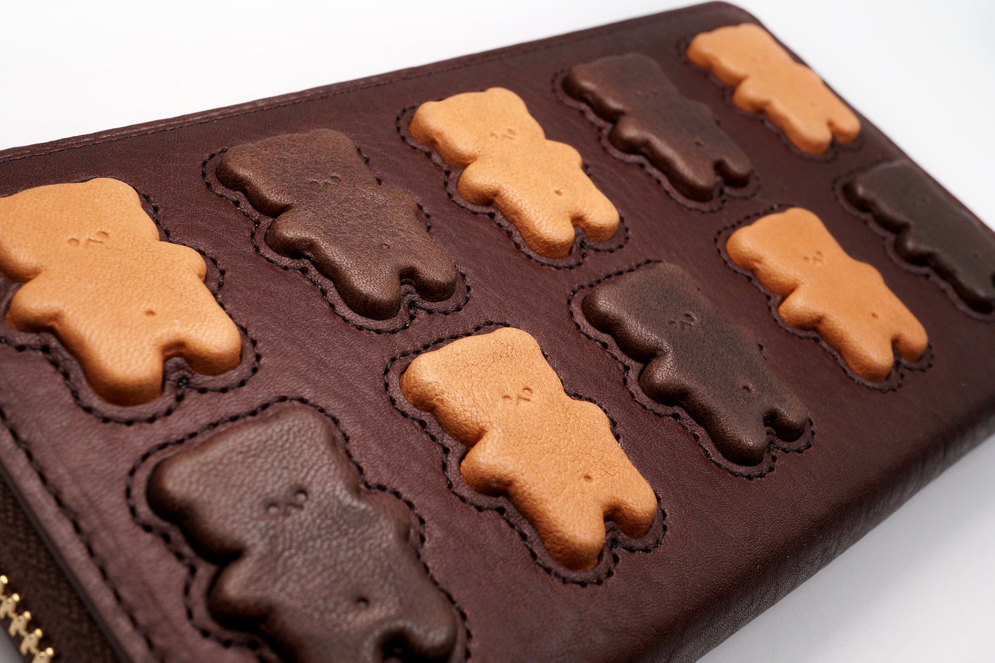ブラウニー生地の上にクマ型のクッキーを並べて焼いた「くまちゃんブラウニー」。そんなホームメイドの可愛い焼き菓子をイメージした本革(牛革)製のラウンドファスナー長財布です。