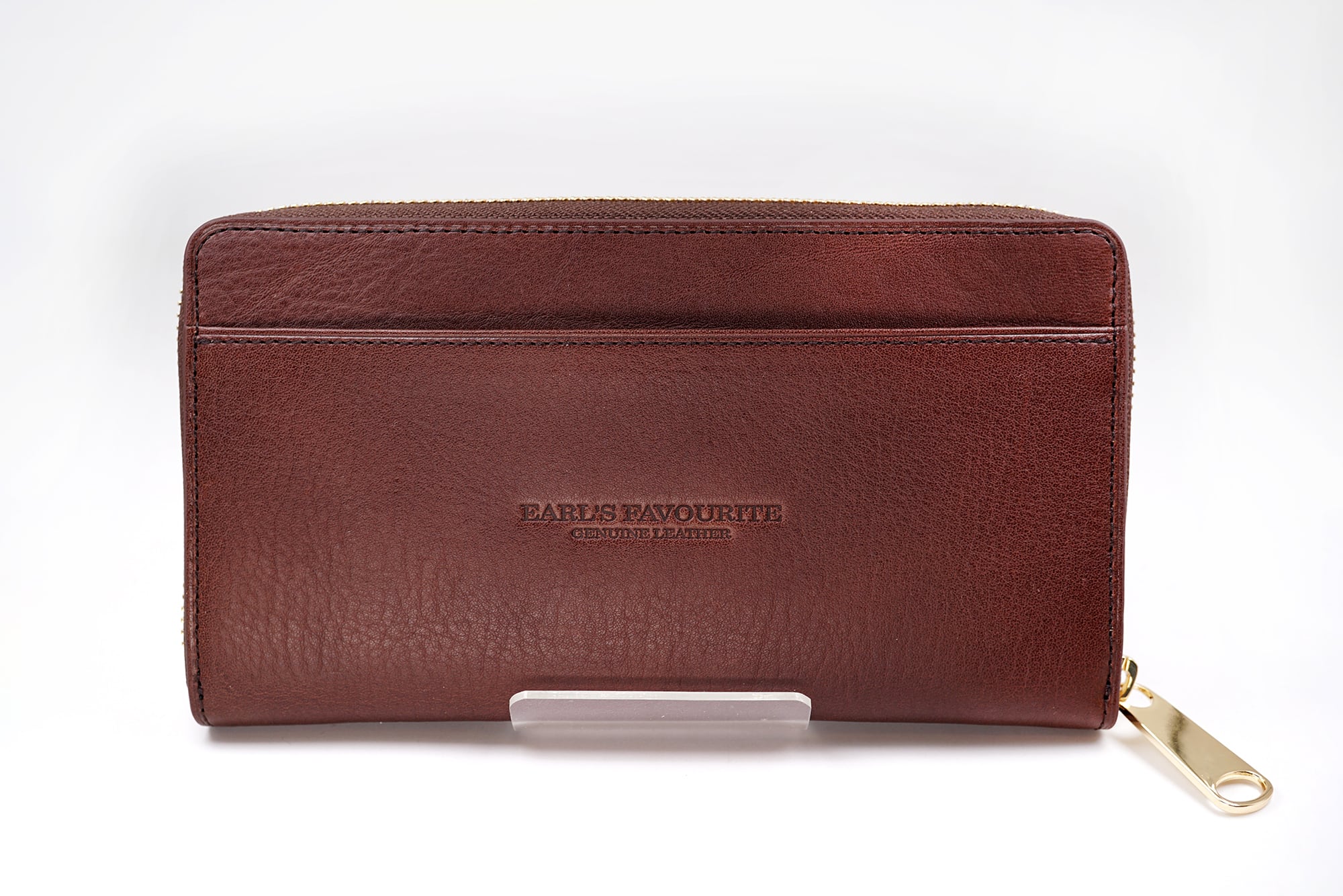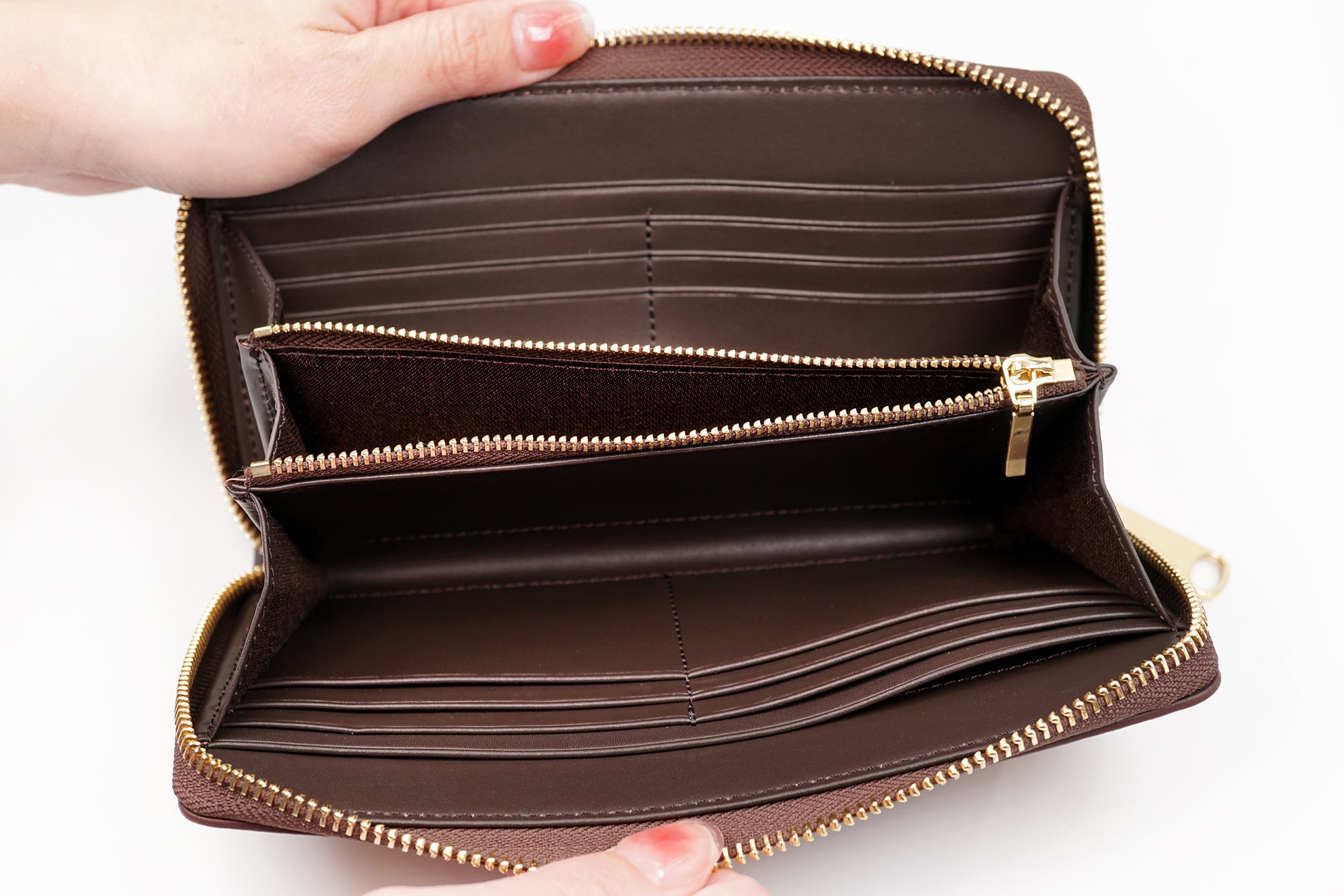 内装もチョコ色の革と布地をセレクト。中央には小銭入れ用ファスナーポケット、両側のカード段は12ポケットございます。また、財布背面にもポケットがありますので、チケットやレシートなどを保管するのに便利です。また、くまちゃんサイズに合わせて一般的な長財布よりも高さが0.5cm程度大きめのつくりになっています。その分容量も増えていますので、使いやすいですよ。