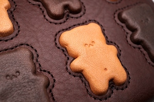 本製品は、「焼き菓子の質感」という世界観に寄り添う革として、上質な植物タンニンなめし革を使用しています。表面を樹脂で仕上げた均一な本革とは異なり、素朴であたたかみのある風合いが魅力です。その性質上、キズやシワなどが見られることがあり、またキズもつきやすい革であることを個性や味としてお楽しみ頂ければ幸いです。また、徐々にツヤと深みのある色にエイジングしていきます。くまちゃんはこんがり焼きあがります。