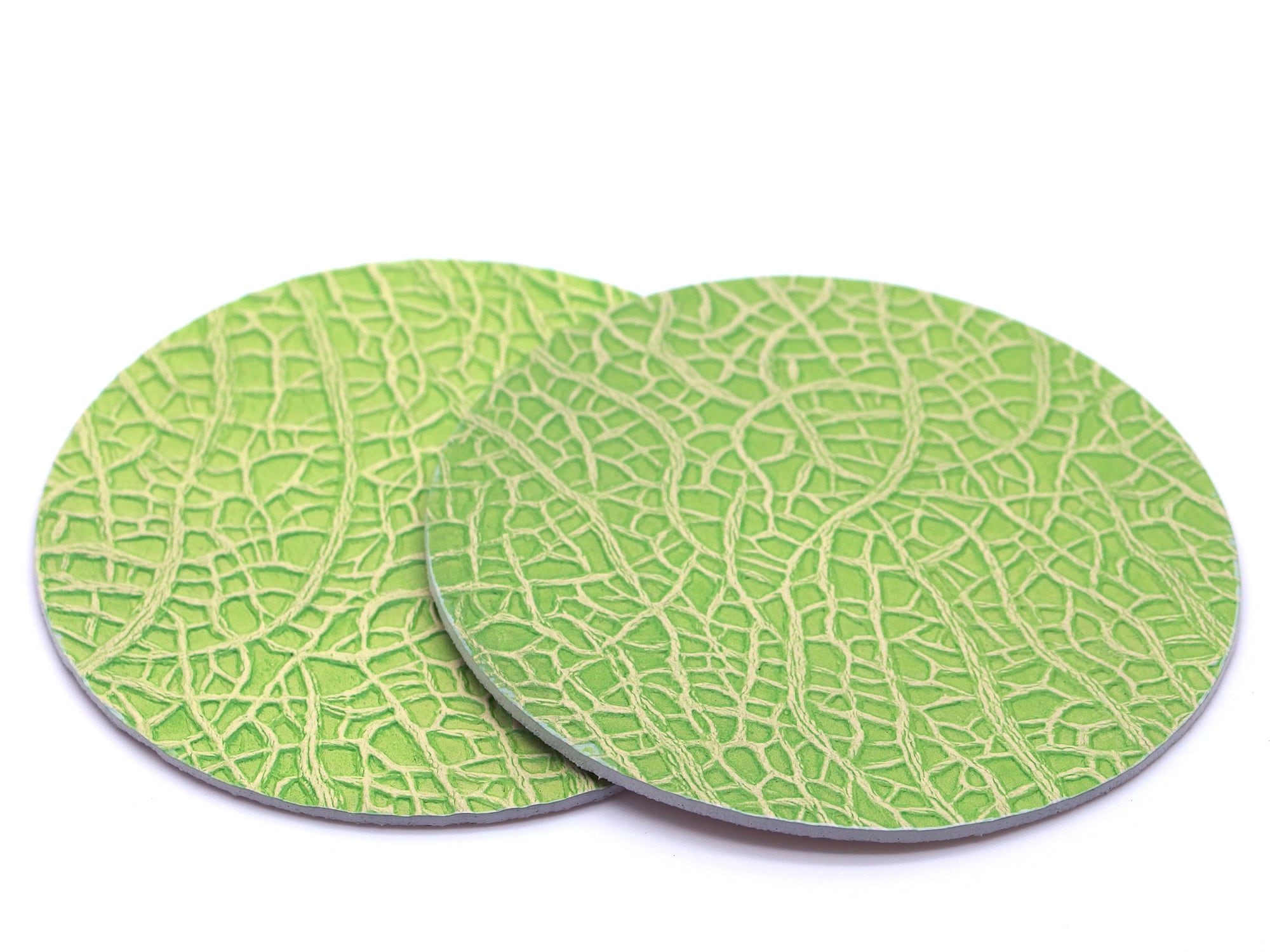 メロンのように特殊加工した牛革製のコースターの2枚セットです。