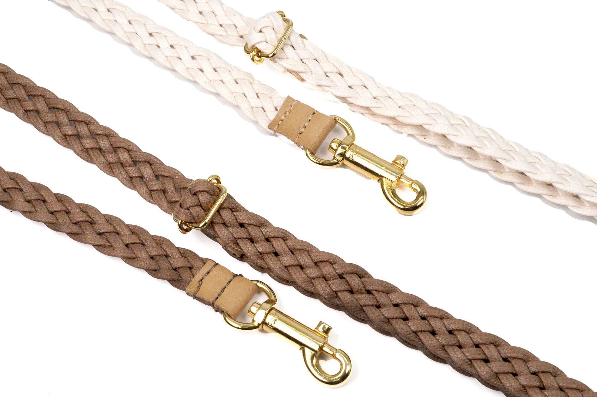 ショルダーストラップは編み模様がおしゃれなワックスブレード(光沢のあるコットン製の編み紐)を使用。オフホワイトとライトブラウンの2色からお選びいただけます。どちらもナチュラルな色合いなので、大人ファッションにもなじみやすいです。肩紐の長さは調節可能です。また、肩紐を外してハンドバッグとしてもお使いいただけます。