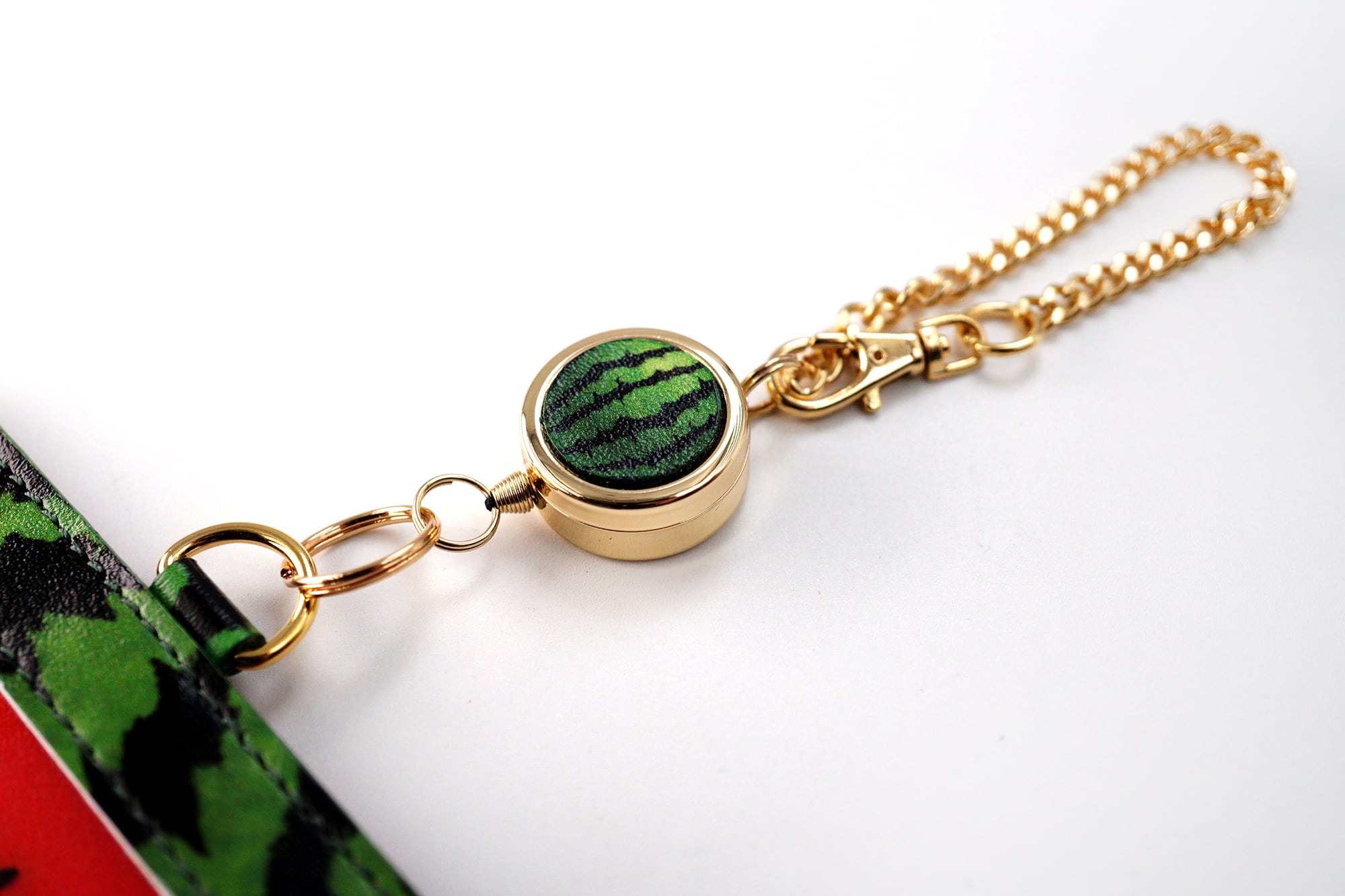 本体はSuicaなどの交通系ICカードが入るようにデフォルメしたスイカ型にしました。リール部分の丸い小玉スイカ(こちらも本革製)もこだわりポイント。バッグの持ち手などに下げておけばそのまま改札タッチできて便利です。